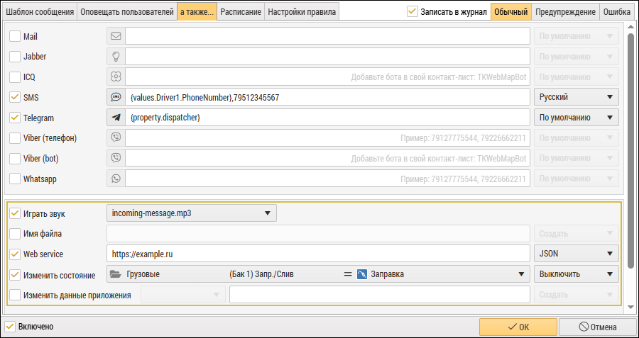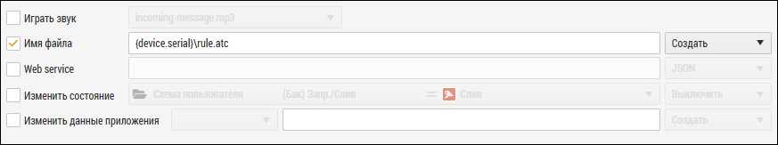 {device.serial}, содержащей серийный номер контроллера.- В создаваемый файл записывается текст сообщения правила, указанный для языка «По умолчанию».