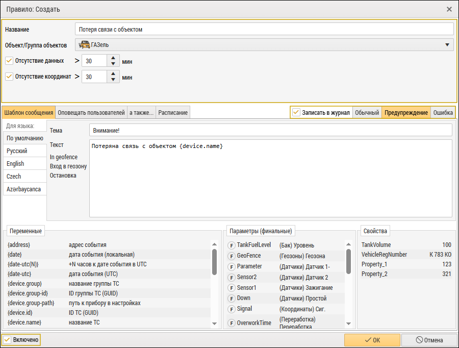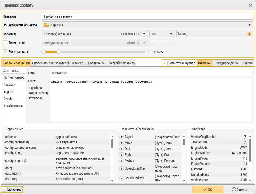 Зажигание = Вкл.илиГеозона = Склад 1. - Параметрам геозон в качестве оператора доступны варианты «В списке» и «Не в списке». Условие с оператором «В списке» будет выполнено, если объект прибыл в геозону, которая есть в списке геозон, выбранном в качестве аргумента. Условие с оператором «Не в списке» будет выполнено, если объект прибыл в геозону, которой нет в списке геозон, выбранном в качестве аргумента. Эти условия позволяют не создавать отдельные правила для определения прибытия объекта в разные геозоны, а объединить их в одно.