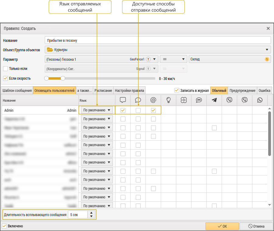 Включите отправку оповещений нужным пользователям, устанавливая чек-боксы в столбцах различных способов отправки сообщений напротив этих пользователей.