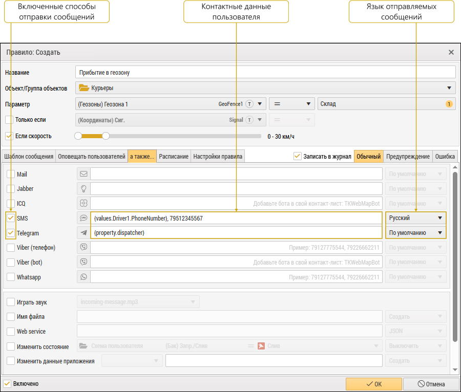 {values.Driver1.PhoneNumber}, гдеDriver1— это табличный параметр с типом GUID, который содержит ID карты водителя, аPhoneNumber— это свойство из реестра, содержащее номер телефона водителя. При такой настройке текущий водитель транспортного средства идентифицируется по карте (параметрDriver1), далее из реестра свойств этого водителя считывается свойствоPhoneNumber, на номер телефона из которого будет отправлено сообщение при срабатывании правила.Полный список переменных приведен на вкладке «Шаблон сообщения». Чтобы не допустить ошибку при написании переменной, рекомендуется вставить нужную переменную или свойство в текст сообщения на вкладке «Шаблон сообщения» и далее скопировать его в нужное поле на вкладке «а также».